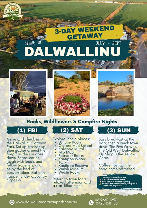 Only 2.5 to 3 hours from Perth, this welcoming Wheatbelt destination offers a beautiful mix of wildflowers, nature, open space, and country charm. During winter and spring, especially from July to September, Dalwallinu becomes an ideal short escape for couples, caravanners, and anyone wanting to slow down for a few days.